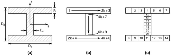FE numerical modelling of H-section steel column with Hughes–Liu beam elements: (a) cross section geometry; (b) integration point numbering; (c) section example for k = 2.