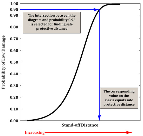 SPD is defined as the minimum required stand-off distance where the probability of low damage based on Equation (2) is at least 95% [86,87,88] or the damage probability is lower than an acceptance criterion 5%. Figure 3 shows schematically an instance of probability of low damage diagram for a given charge weight, based on stand-off distance, that can be obtained from the results of reliability analysis for any blast loaded member. The concept in Figure 3 is shown for the specific case of probability of low damage 95%. The philosophy is that the structure object of analysis is examined for different blast scenarios (under constant charge weight and a variable stand-off value) and the probability of low damage in each case is calculated and drawn in Figure 3. In the other words, each point in Figure 3 corresponds to probability of low damage for the selected configuration under a blast scenario.