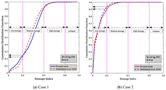 In order to verify the current MCS results based on beam element formulation, major outcomes from the reliability analyses presented in [52] are compared in this study. In more detail, the numerical results of two loading cases (Case 1 and Case 2) are considered, as obtained for a steel column with section type IPBv200, nominal length of 3.6 m and pinned ends. The column from [52] is made of ST37 steel, with density of 7850 kg/m3. Yield strength, elastic modulus, Poisson’s ratio and failure strain are set equal to 240 MPa, 210 GPa, 0.3 and 0.2 respectively. In Case 1, the column is subjected to W = 55 kg of TNT and R = 6 m. In Case 2, the explosive charge weight and the stand-off distance are set to 55 kg and 8 m. For both configurations, the number of simulations is set to 300. The comparison of past [52] and current numerical results is shown in Figure 5a,b, for Cases 1 and 2, respectively, in terms of CDFs for DI.