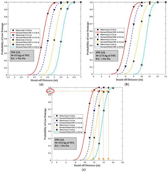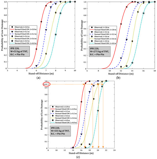 The curves of probability of low damage are obtained in this paper for all the steel sections presented in Table 2 via reliability analysis, for both the pinned and fixed ends under different blast scenarios (with TNT charges of 55, 275 and 555 kg). For example, Figure 6a–c illustrate the numerical curves for IPB220 with pinned ends under explosive charge weights of 55, 275 and 555 kg, respectively. Each plot corresponds to a column with a specified length and explosive charge. Furthermore, it consists of some observed points that are obtained from reliability analyses. Each observed point and its probability of low damage is in fact the result of a reliability analysis based on the MCS method with 300 simulations. In total, 15,900 simulations were performed to extract Figure 6a–c, indicating the high amount of computational effort, which was around 47.4 h. Additionally, the normal CDFs have been fitted to the observed points for each case related to a specified column length, to convey a better understanding of presented concepts in Section 4 and also calculating the probability of low damage for points other than the observed points, if necessary. Given that the stand-off distance corresponding to the 95% probability of low damage is considered for finding safe distance (see Figure 4), then the fitting operation was used to find the stand-off distance corresponding to exactly 95% probability of low damage. In this case, lower tails are not important and will not affect the calculation and extraction of SPD and SSD.