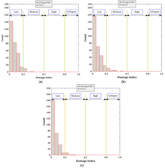 DI histograms, as obtained from MCS for IPB260 steel column with length of 3.6 m and pinned ends under: (a) 55, (b) 275 and (c) 555 kg of TNT.