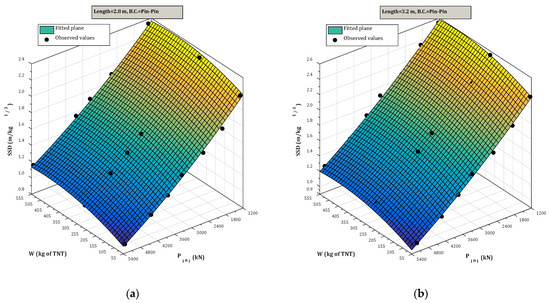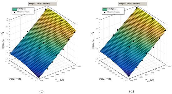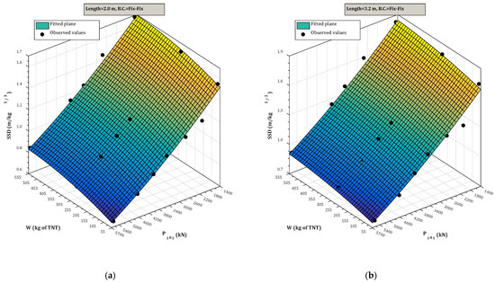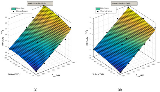 Figure 9 and Figure 10 show the predicted SSD values and the corresponding fitted planes (according to Equation (11)) for pinned and fixed ends and for different column lengths. In these figures, the numerical data collected from reliability analyses for different steel configurations and blast scenarios are represented by 21 points which are used for curve fitting (Equation (11)).