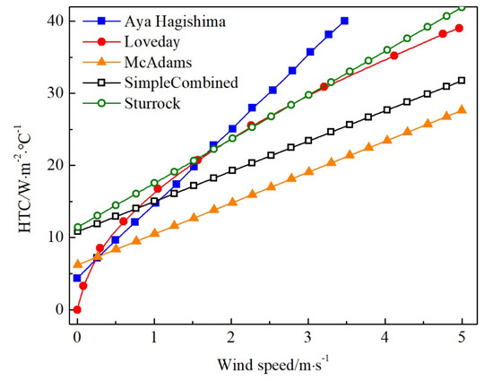 EnergyPlus 8.7 [31] was mainly developed by the US Department of Energy and National Renewable Energy Laboratory and it was employed to conduct numerical simulations in this study. Several models can be used to describe dynamically changing external SHTCs, including TARP, MoWiTT (Mobile Windows Thermal Test), DOE-2, and SimpleCombined. TARP, Simple Natural Convection, and Ceiling Diffuser were developed for internal SHTCs. The TARP model considers the wind speed and surface roughness, as well as the differences between natural and forced convection, the direction of heat flux, and wind along the building surface [18,32,33]. The researchers have shown that the predictions of BLAST are very close to the actual measurements [34,35]. The TARP algorithm was derived from the ASHRAE literature by Walton (1983), and was in good agreement with the curve fitting values of BLAST simulation results, as shown in Figure 4 [36,37]. Therefore, the TARP model was used for comparison with the results produced based on constant SHTCs to obtain more reliable results. The SHTCs at the internal and external surfaces are defined as follows: