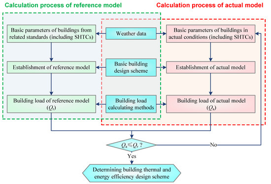 For the trade-off option, the thermal performance of the building components was only considered for the actual building model and reference building model in this study. However, the annual energy consumption is based on the annual cumulative load of heating, ventilation, and air conditioning (HVAC) systems, so the assessment results determined according to the annual energy consumption and building load for an actual building model and reference building model should be consistent for a HVAC system with the same efficiency (see Figure 2). Therefore, the building energy consumption could be replaced with the building load as the criterion for the trade-off option to simplify the process.