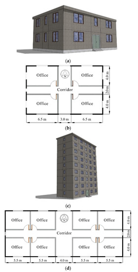 The present study focused in office buildings in severely cold and cold climate zones in China. According to the national standard in China (Design Standard for Energy Efficiency of Public Buildings (GB 50189-2015)), the corresponding limiting values and energy efficiency performance were restricted to two levels based on different shape factors. Therefore, two typical office buildings were selected as representative buildings, as shown in Figure 3. The building model with the building shape factor φ = 0.49 had a length of 16.0 m, width of 10.0 m, height of 6.0 m, story height of 3.0 m, and window–wall ratio of 0.2 (see Figure 3a,b). The building model with φ = 0.29 had a length of 26.0 m, width of 10.0 m, height of 29.7 m, story height of 3.3 m, and window–wall ratio of 0.2 (see Figure 3c,d). The buildings faced south and the window–wall ratio was within the range recommended in the related standard. The building envelope constructions were those employed widely in cold and severely cold zones of China. The thermophysical properties of the building materials and their constructions are listed in Table 1 and Table 2.
