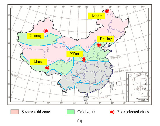 According to the “General Principles of Civil Building Design”, the five cities selected for investigation from the severely cold zone and cold zone were Mohe, Urumqi, Beijing, Xi’an, and Lhasa. The locations and annual average temperature and humidity values are shown in Figure 5. Xi’an, Beijing, and Lhasa are located in the cold zone. Xi’an and Beijing have similar climate characteristics, except for differences in the cold and hot temperatures. Lhasa is located on the Tibetan Plateau at an altitude of more than 3000 m, with abundant sunshine, intense solar radiation, and comfortable summers. The calculation of the heat load demand was mainly considered in the winter. Mohe and Urumqi are located in the severely cold zone, where the daily temperature range and annual temperature range are relatively large. Urumqi is cold and dry, and Mohe is located in a high latitude region. The significant temperature differences greatly affected the cold and heat load calculations.