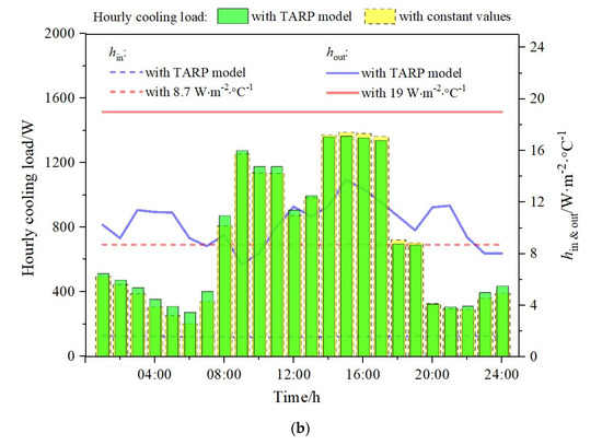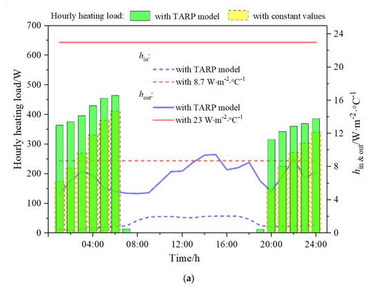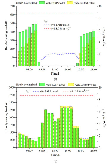 Finally, the hourly load behavior was examined with different internal and external SHTCs on a typical day, as shown in Figure 8. The results presented in Figure 8 comprise the superposition of Figure 6 and Figure 7. For a typical day in winter, the hourly heating load was much larger with the TARP model than that with constant values. The maximum deviation of 110.0% occurred at 20:00. For a typical day in summer, the results were similar to those in other severely cold and cold climate zones in China under different calculation conditions. The heating load generally attracted more attention for Xi’an in China. In addition, the study methods could be duplicated for other selected cities. Therefore, the daily load behavior was examined with different SHTCs on a typical day.