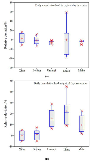 Boxplots showing the relative deviations in the daily cumulative load on a typical day with different SHTCs: (a) Daily cumulative load on a typical day in winter; (b) Daily cumulative load on a typical day in summer.
