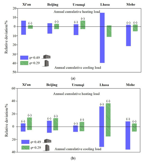 The effects of different shape factors and locations on the daily cumulative loads of whole buildings were studied. The relative deviations in the daily cumulative load with TARP-based internal SHTCs and constant SHTCs are illustrated in Figure 9a. For a typical day in winter, the effects of SHTCs on the daily cumulative load behavior were moderate in all cities except Lhasa. For φ = 0.49, a relative deviation of 60.3% was observed in Lhasa. Among all of the other cities, the largest relative deviation occurred in Xi’an, with a value of 16.6%. For φ = 0.29, the relative deviation was lower than 12.4% in all other cities, which was very different from the result for Lhasa. For a typical day in summer, relatively large relative deviations in the daily cumulative load were observed in Lhasa and Urumqi for φ = 0.49, i.e., 30.9% and 23.1%, respectively. For all of the other cities, the relative deviation was lower than 20%. For φ = 0.29, a relative deviation lower than 12.1% was observed in all cities. In most conditions, the relative deviation increased as the shape factor increased.