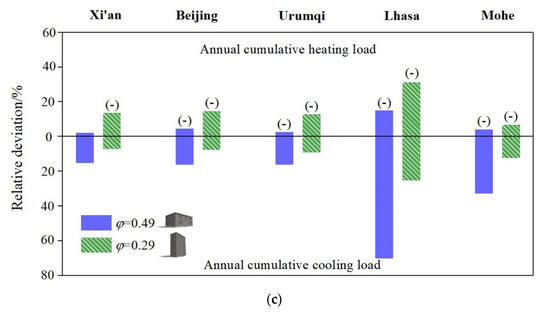The relative deviations in the daily cumulative load results with TARP-based internal and external SHTCs and constant SHTCs are shown in Figure 9c. The results demonstrate the comprehensive effects of dynamically changing the SHTCs on two sides. For a typical day in winter, the maximum relative deviation of −20.9% was observed at Lhasa with φ = 0.29. However, for a typical summer day, the absolute value of the relative deviation in Xi’an and Beijing was lower than 3.0%. Thus, for these cities, selecting different SHTCs had little influence on the cumulative heating load results on a typical summer day. However, for the other three cities, the differences could not be ignored at φ = 0.49, where the relative deviations were larger than 20%.