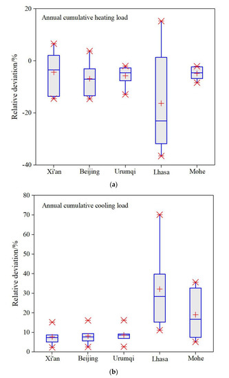 Boxplots representing the relative deviations in the annual cumulative heating and cooling loads with different SHTCs are shown in Figure 12. The deviations in the heating loads were considerable in Xi’an, Beijing, and Lhasa. The relative deviation even ranged from 41.5% to 15.0% because Lhasa is located on the Tibetan Plateau. The traditional approach for predicting the building cooling load using constant SHTCs was not accurate, especially in Lhasa and Mohe because Lhasa is located on the Tibetan Plateau and Mohe is at the highest latitude.