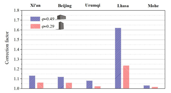 - Corrections were obtained for the annual cumulative loads based on the relative deviations between the results produced by the TARP model and with the traditional constant SHTCs. The correction factors were determined as 67.5% and 25.3% for Lhasa with φ = 0.49 and 0.29, respectively. In Xi’an and Beijing, the correction factors determined with φ = 0.49 were 13.3% and 12.0%, respectively. The correction factors were lower than 5.0% for other conditions, thereby indicating that no corrections are required.