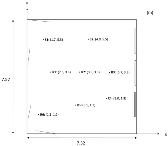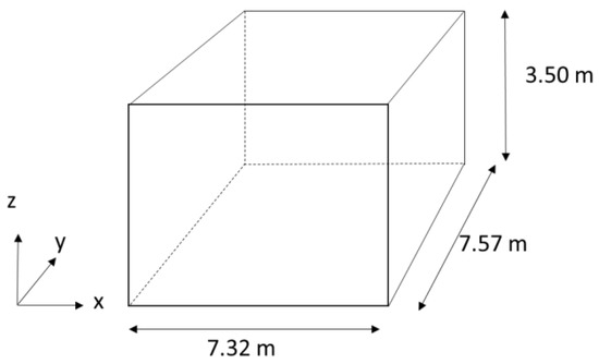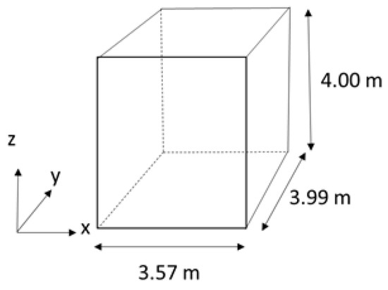 Measurements were conducted in a mock-up of a rectangular classroom with the dimensions 7.32 × 7.57 × 3.50 m, see Figure 3, and in a reverberation chamber with the dimensions 3.57 × 3.99 × 4.00 m, see Figure 4. In both cases, the ceiling was installed at a height of 2.70 m from the floor.