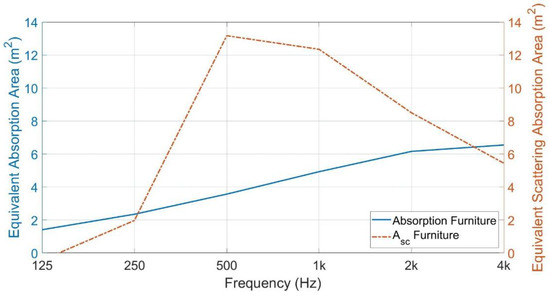 These furnishings contributed to a small amount of absorption at the higher frequencies and scattering at mid-frequencies. Absorption properties were evaluated according to diffuse sound field theory, Sabine, from measurements when only furniture was placed in the classroom, with no absorbent ceiling. Without a ceiling, it has been assumed that the sound field is diffuse, and therefore, the Sabine formula is used in this case. The absorption properties and equivalent scattering absorption area, i.e., both absorption and scattering from the furniture, were calculated using Equation (4). The absorption and scattering from the furniture can be found in Figure 6.