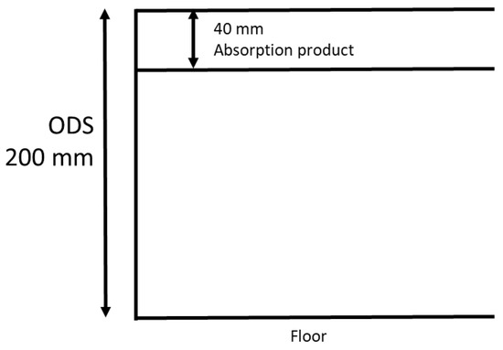 The porous absorbers used were a commercial product made of glass wool. The thickness of the product was 40 mm, and its air flow resistivity was 40 kPas/m2, which was measured in accordance with ISO 9053-2 [41]. The measurement of the absorption properties for this product was performed according to ISO 354 [42] with the measurement made at an overall depth of the system (ODS) of 200 mm and was further evaluated according to ISO 11654 [43]. The weighted absorption coefficient αw is equal to 1. The sketch up ODS set up for a 40 mm product can be seen in Figure 7.