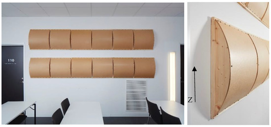 The diffusers used were prototypes made of wood, with a timber frame and a surface covered with hardboard material. The module size was 600 mm × 600 mm, maximum depth 100 mm. See the sketch in Figure 8.