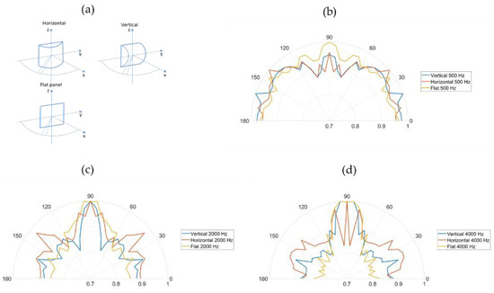 Diffusion characteristics for one diffuser related to the coordinate system defined in (a) for the diffusers mounted vertically and horizontally, as well as for a flat panel, for the frequencies 500 Hz (b), 2000 Hz (c), and 4000 Hz (d).