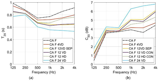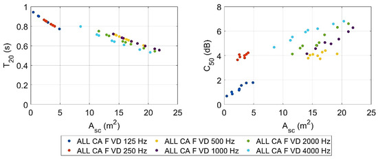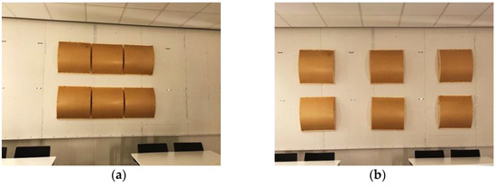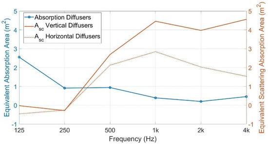 In the study presented in this paper, Equation (4) has been used to calculate the scattering and absorption properties, Asc, for diffusers. is the reverberation time measured with diffusers (for different configurations, see below).