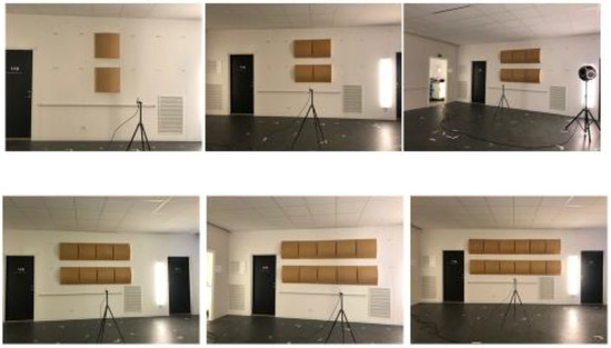 The same set-up of diffusers was always used for two adjacent walls; see Figure 15. All configurations are described in Table 1. The left part of the table shows configurations without furniture and the right part of the table shows corresponding configurations with furniture.