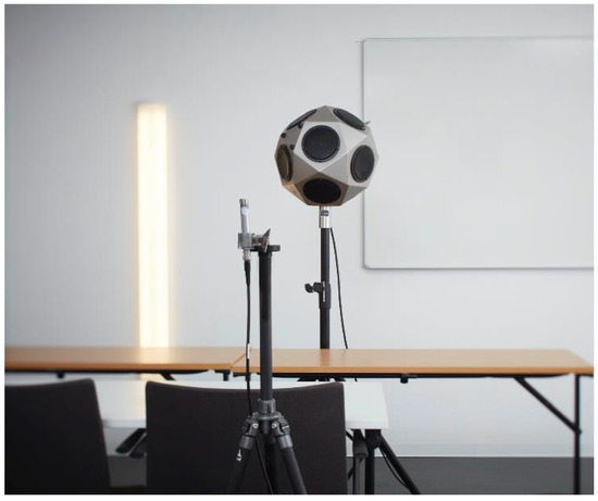 The room acoustic parameters evaluated were reverberation time (T20) and speech clarity (C50), which were defined according to Equation (5) below. Measurements were performed using a DIRAC system (DIRAC type 7841, Ver.6.0). An exponential sweep signal was used as excitation. An omnidirectional loudspeaker with dodecahedron geometry was used. The center of the loudspeaker was 1.55 m from the floor. An omnidirectional microphone was used as a receiver 1.20 m from the floor. The loudspeaker and microphone used in the measurements can be seen in Figure 16.