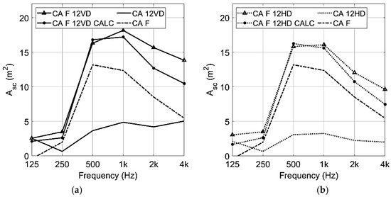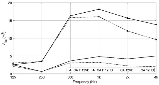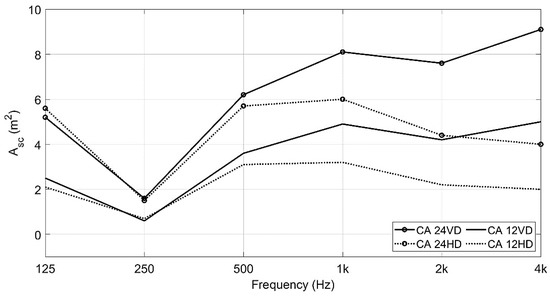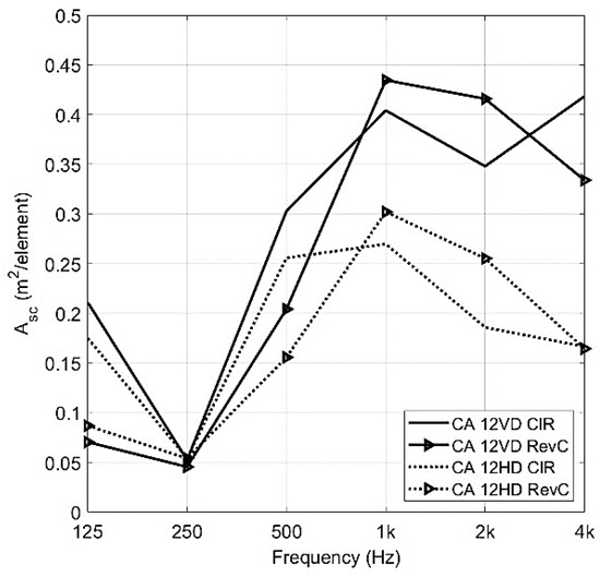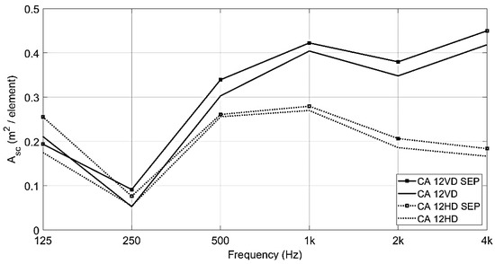 The diffusers do not have specific directional scattering properties at these low frequencies. At the higher frequencies, the diffusers do have directional scattering effects, which are dependent on the orientation of the diffusers. This can be shown in terms of Asc calculated by using Equation (4). The Asc includes both absorption and scattering effects. The absorption together with the total equivalent scattering absorption area, Asc, exemplified for 12 diffusers, vertically and horizontally oriented, can be seen in Figure 12. The graph shows the same value for the two different orientations in terms of absorption. The different scattering properties, in terms of Asc, show the orientation dependency for the higher frequency range. In the case of vertical diffusers, sound waves directed toward the ceiling have a larger effect on the Asc compared to the horizontally oriented diffusers. For the latter, sound waves are still dispersed but are mainly redirected in the horizontal plane and consequently not directed to an absorbent surface. Since Asc accounts for both absorption and scattering, the Asc value is lower for the horizontally oriented diffusers in the higher frequency area, which is where the diffuser affects the sound field the most.