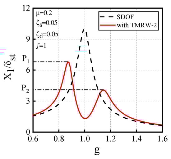 Using the formula of dynamic amplification factors above, Figure 7 compares the uncontrolled and controlled vibration responses. One can see that from the results, both TMRW-1 and TMRW-2 controlled systems can effectively control the response amplitude of the main mass. For the TMRW-1 controlled system, the dynamic amplification factor at the tuning frequency is equal to zero, while TMRW-2 control can improve the deterioration of damping performance caused by the excitation frequency variation.