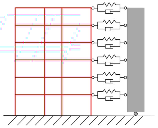The structural modeling is performed using ANSYS. The beams and columns in the structure are both stimulated by the linear finite strain beam element Beam188. Based on the principle of equivalent stiffness, the constitutive model of reinforced concrete members is simplified to be piecewise linear []. The design goal of the rocking wall is to keep elasticity under earthquake excitations, so the elastic Shell188 is adopted for the wall. Shell181 is a four-node element suitable for analyzing moderately-thick shell structures. The horizontal connections, connecting the rocking wall and the frame columns, are realized by Combin14 which is defined by two connected nodes, damping coefficients, and a spring constant. Using the design process of TMRW-2 in Section 2.4, the values of stiffness and damping coefficient in horizontal connections are listed in Table 3. Table 4 shows the first natural frequencies of structural models obtained from modal analysis results.