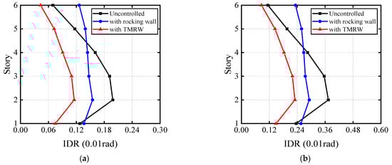 Comparison of the IDRs under Kobe excitation: (a) 0.1 g case; (b) 0.2 g case.