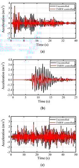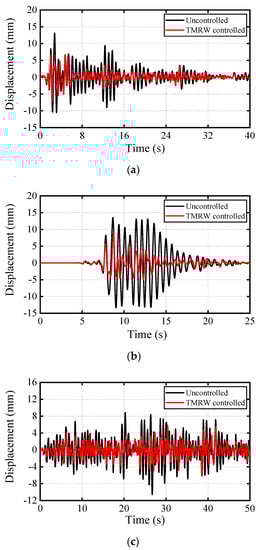 Considering different factors of ground motion (type, intensity, duration, etc.), three earthquake excitations shown in Figure 9 are adopted in the dynamic analysis. The peak accelerations of these three seismic waves are set between 0.1 g and 0.2 g. For each excitation case, uncontrolled and TMRW controlled scenarios are examined.