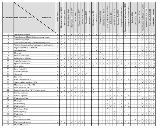 Throughout the twentieth century, formwork engineering developed in lockstep with the expansion of concrete construction [17]. The developments and technological advancements in formwork engineering led to the widespread use of industrial FWSs across the world [18]. Since there are many FWSs available, the selection of the appropriate FWS depends on various compromising and conflicting criteria [7,19]. Therefore, a number of quantitative and qualitative criteria have been identified in previous studies that may affect the selection of FWSs in building construction projects. The majority of these studies have identified and/or ranked the FWS selection criteria [13,20], while others have employed multi-criteria-decision-making (MCDM) methods to solve the FWS selection problem [2,21]. The following is a brief chronological summary of these studies.