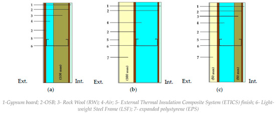 Classification of LSF wall constructions, depending on the position of the thermal insulation: (a) cold frame construction; (b) warm frame construction; (c) hybrid frame construction [21].