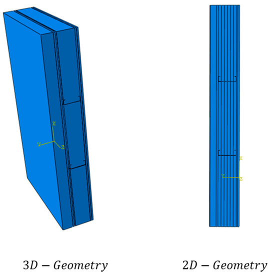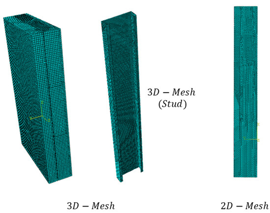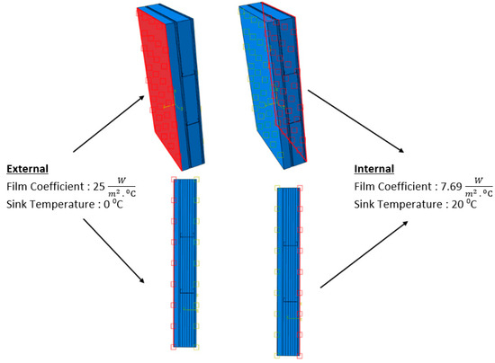 Two-dimensional (2D) and three-dimensional (3D) heat transfer analyses were conducted in 3D FEM software, ABAQUS/CAE [32], to determine the LSF wall configurations’ thermal transmittance, and it was observed that both 2D and 3D results were identical. Steady-state heat transfer depends on the thermal conductivity of the material. Wall configurations considered in this study consist of gypsum plasterboards, OSB, steel studs and filling materials. Each material’s thermal conductivity and orientation has an influence on the wall panel’s U-value. Thermal conductivity values of the materials used in the study are tabulated in Table 3. External and Internal temperature boundary conditions were set for 0 °C and 20 °C, respectively. The convective surface heat transfer coefficients were set according to BS EN ISO 6946 [33]. Two surface film condition interactions were defined separately in the external and internal surfaces to achieve these boundary conditions in the developed FE model. For the external surface, film coefficient of 25 W/m2 K was set with a sink temperature of 0 °C, whereas for the internal surface, film coefficient of 7.69 W/m2 K was set with a sink temperature of 20 °C [21,33]. Heat transfer elements (DC3D8 elements) were used to develop the model. DC3D8 is an 8 node linear isoparametric element used in Abaqus CAE to solve 3D heat transfer problems. Global seeding of 20 mm was used in the 3D analysis for all the elements except studs, where 2 mm mesh size was used. In 2D analysis, 10 mm mesh size was used for the entire wall panel. Steady-state heat transfer analysis was conducted to obtain the heat flux results.