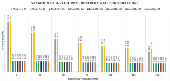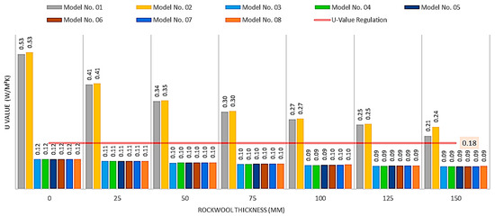 Obtained U-value results of 112 models as described in Section 6 are tabulated in Table 7. Although EN ISO 6946 [34] specifies that the final results of thermal resistance values should be rounded to two decimal places, the U-values are reported with three decimal places to enhance the precision of comparative analysis even when similar values are acquired. U-value variation of each configuration with the internal insulation layer thickness is graphically represented in Figure 11. It can be observed that the U-value is reducing with the internal insulation thickness. Since insulation material rockwool has a lower thermal conductivity, the insulation layer increment reduces the LSF wall’s thermal transmittance. Further, results exhibit that the effect of internal insulation thickness is higher in Model 01 and Model 02, where no VIP was used. Model 01 reduction percentage of U-value is 60% from 0 mm internal insulation to 150 mm insulation, whereas in Model 03, the reduction is only 23%. This result was observed due to the lower thermal conductivity of VIP. Since the thermal conductivity of VIP is less than 10 times that of rockwool approximately, according to Equation (4) it can be argued that the effect of 20 mm VIP is equal to 200 mm (10 times 20) of rockwool. VIP has dominated the U-value of the LSF wall system over the rockwool, which makes the effect of the internal insulation thickness insignificant.