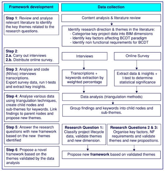 A mixed qualitative and quantitative method was designed and used to address the research questions. These research questions were addressed by identifying the data from projects’ lifecycles, which are relevant to transact with sustainable BCDTs, the key factors affecting the BCDT paradigm shift, and the non-functional requirements for BCDTs in CI 4.0. Due to the exploratory nature of the investigation, a qualitative approach was adopted by interviewing the most relevant and experienced experts in the field. This research method was used since there is a limited amount of in-depth information about BCDT and associated factors and processes from a professional perspective.