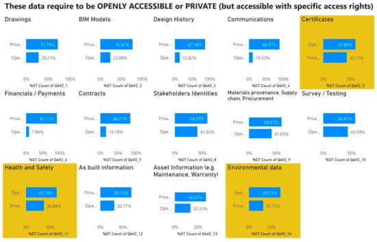 The interviewees’ answers suggest that there is currently a lack of security associated with open data APIs, data silos, and data storage, which can lead to security breaches and data leaks. Table 8 shows that it is key to secure data related to sensitive projects (infrastructure, banking, and defence projects), financial data, assets information, smart buildings data, personal information, Big Data, confidential information, processes related to data sharing, and project data in general. Additionally, it is necessary to secure the entire IT infrastructure, including data storage, databases, and the systems transferring data. The security of smart building management systems (BMS) is also an essential requirement.