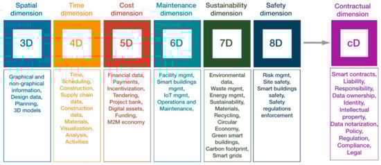 DTs leverage various technologies of CI 4.0 such as 3D simulations, BIM, IoT, 4G and 5G networks, blockchain, edge computing, cloud computing, ML, and AI. DT integrates data from the information value chain to improve assets performance and benefit customers, owners, operators, governments, investors, and society as a whole []. The data value chain relates to key processes of the data lifecycle, such as data acquisition, data analysis, data curation, data storage, and data usage []. Hence, the Big Data from the data value chain of CI projects form a key component of DT, and it is essential to categorize the project lifecycle data that should be considered for sustainable BCDT in CI 4.0. The BIM dimensions [] provide a widely accepted and sustainable framework to categorize BIM data from the lifecycle of projects.