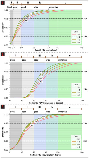 - Using cumulative probabilities of view access enables comparing different architectural configurations by reporting potentials of experiencing different views in space. Cumulative probabilities could show likelihoods of experiencing a specific range of FOV in the space. Cumulative probabilities could also inform potential FOVs which could be experienced from different percentages of viewpoints, e.g., 75% or 25%, in space.