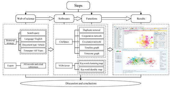 Scientometrics is a branch of informatics that can quantitatively analyze bibliometric characteristics and objectively reflect the development history and trend of scientific research based on the published literature [80,81]. It has been widely used to assess scientific contributions, capture scientific developments, figure out map knowledge structures, and identify emerging trends [82,83,84,85,86]. Scientific knowledge mapping combines the theories and methods of applied mathematics, graphics, information science, and information visualization technology with citation analysis and co-occurrence analysis, visualizing the core structure, development history, and frontier fields of a given research field by the visual mapping [86,87].