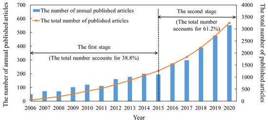 Figure 4 shows the annual and total number of published articles from the United States and China, respectively, which are the two largest nodes in Figure 3, indicating that their numbers of published articles are much higher than those in other countries. The overall trend of these two countries is on the rise, of which China has a faster upward trend. The United States has published 837 papers, accounting for 25.3% of total studies, while China has published 739 articles, accounting for 22.3%. Comparing the number of articles published in the United States and China from 2006 to 2020, we found that the number of articles published in the United States increased steadily, while that in China grew slowly from 2006 to 2015, but rapidly after 2016, the growth trend of which is consistent with that of the overall increase.