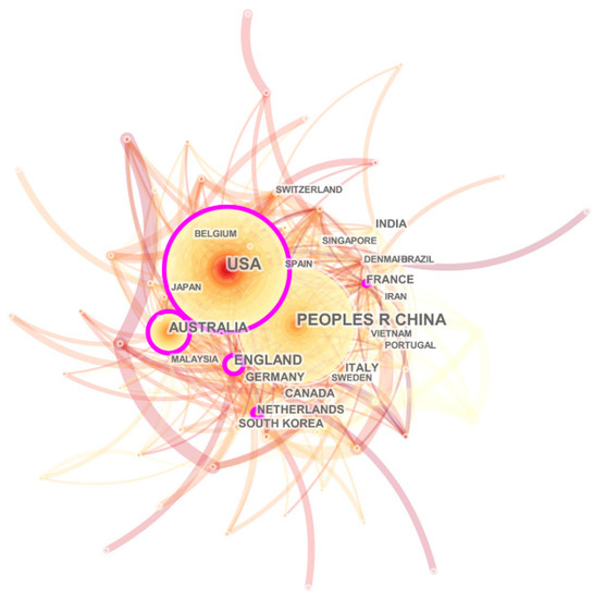 The cooperation network between countries is depicted in Figure 3. Generally, all nodes in the network are connected as a whole, indicating that each country cooperates with others, rather than researching alone. Although England ranks fourth in the number of publications, the betweenness centrality (0.26) which measures the importance of nodes in the network is more than other countries, reflecting the beneficial international influence of the research results in the field of urban floods. In addition to England, the United States, Australia, China, France, and the Netherlands have relatively high centrality, which is 0.21, 0.18, 0.17, 0.16, and 0.16, respectively.