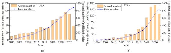 Trends comparison of the number of publications between the United States and China: (a) the United States; (b) China.