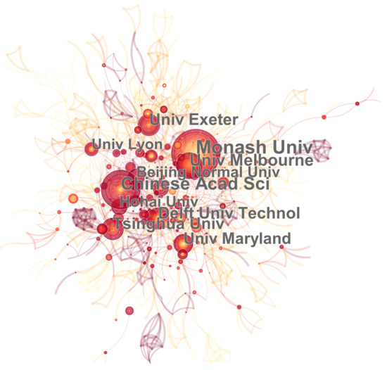 CiteSpace was used to establish a cooperation network and visualize the research distribution in different institutions in the research field of urban floods [108]. The institutional cooperation network is depicted in Figure 5, which consists of 801 institutional nodes with 1226 connections. Monash University is the most significant core institution, which has published 99 articles in different journals between 2006 and 2021, followed by the Chinese Academy of Sciences (count = 81), The University of Melbourne (count = 57), Tsinghua University (count = 51), The University of Exeter (count = 50), and Delft University of Technology (count = 50), which play an intermediary and leading role. In addition, the global distribution of urban floods research institutions was uneven. The top 20 institutions with the largest number of papers published are mainly located in China (count = 6), Australia (count = 4), and the USA (count = 4). There are 36 institutions with more than 20 papers published.
