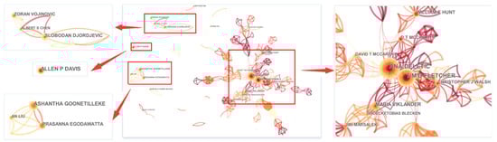 Co-authorship network analysis not only facilitates the discovery of scholars and institutions worthy of attention, but also provides references for evaluating academic influence [109]. An authors’ cooperation network is generated as in Figure 6. There are 3359 nodes and 7262 links and the network density is 0.0013. Deletic and Fletcher occupy the largest node position, which is consistent with the number of published papers. As can be seen from the graph, several clusters have been formed according to the close cooperation between the authors. Cluster A has a large number of researchers, including Ana Deletic, Fletcher Tim, McCarthy David, William Hunt, Maria Viklander, and so on. The number of articles published by the members is ranked first, second, fourth, seventh, and ninth, respectively, and the number of articles published is 57, 50, 33, 25, and 24, respectively. Among the top 10 authors in the number of published articles, the number of authors in cluster A accounts for 50%, indicating that this cluster is one of the most important research teams in the urban floods field. The number of authors in cluster B, represented by Ashantha Goonetilleke, Prasanna Egodawatta, and An Liu, is lower than that of cluster A, and the cooperation network is relatively small and simple. The number of articles published by the top two representative authors is within the top ten of all authors. In cluster C, Slobodan Djordjevic is the core researcher, whose number of articles ranks sixth among all authors in the urban floods field, and who cooperates with Zoran Vojinovic, Albert Chen, and other scholars. The different researchers have a small amount of cooperation, but with low aggregation. In particular, cluster D only contains one author, namely Allen Davis, in the cooperation network diagram, indicating that the author has less cooperation with others.