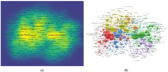 Density and clustering map of co-occurrence keywords in the urban floods field: (a) the keyword density map; (b) the keyword clustering map.