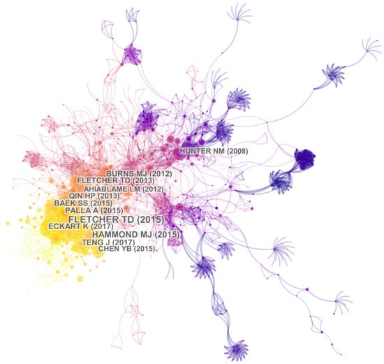 Co-citation of references refers to the phenomenon in which two or more references are cited by the same document. The analysis of literature co-citation in CiteSpace reveals the theoretical knowledge foundation of relevant research by analyzing the high frequency of co-citation literature and the knowledge structure of a research field is revealed by analyzing the key nodes and clusters in the co-citation network [127]. The schematic of literature co-citation was obtained as shown in Figure 8. The nodes represent the cited literature, whose sizes denote the citation frequency. The color of the nodes depicts the citation time corresponding with the time bar above, and the labels on the nodes are the first author and publication year of the article.