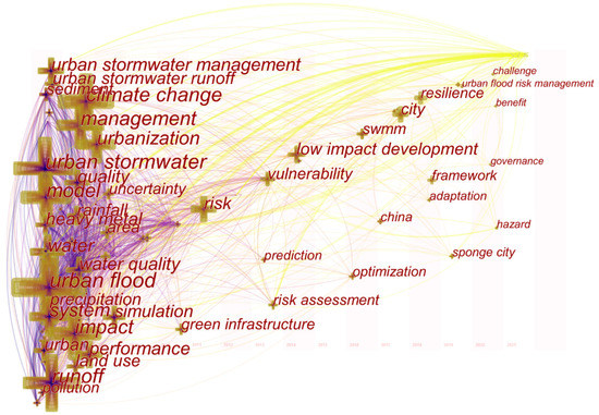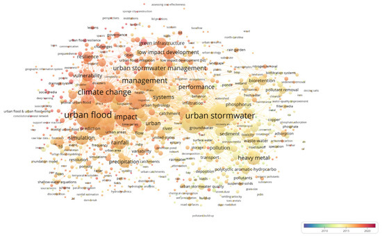 In this figure, it should be noted that the color of nodes is determined by the average time of each keyword year, and the bluer the node is, the earlier the research year is, while the redder the node, the more recent the research year. We found that researchers paid more attention to the problem of urban floods pollution before 2015. Then, the methods of model and numerical simulation were used to research urban stormwater management, low impact development, and so on. The current studies mainly consider cities and urban vulnerability and resilience under the background of climate change and urbanization.