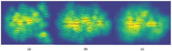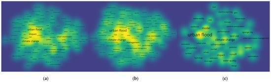 It can be seen from Figure 12 and Table 4, from the perspective of the number of keywords, the total number of articles published from 2006 to 2010 is the least; correspondingly, the number of keywords is the least, and the total frequency of 5 times or more is 109. The total number of published papers is the highest in 2016–2021, namely 723. From the perspective of research hotspots, the overall high-density areas in Figure 12a are relatively small, as well as scattered, indicating that the research focus in the early research stage of the urban floods field is low and the correlation between hot spots is not so strong compared to the latter. The number of research hotspots increased and the concentration became stronger in Figure 12b. In Figure 12c, the research focuses are further concentrated, which is shown in the expansion of yellow areas in the figure, and different yellow areas begin to overlap to form a new bigger yellow area. This is because more and more scholars have joined in the research of the urban floods field over time, and the number of published articles gradually increased, leading to the rise of keyword co-occurrence frequency.