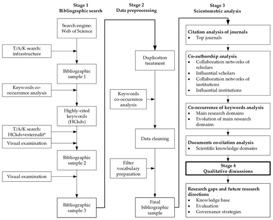 The scientometric analysis can quantify the relationships in disciplines, fields, specialties, and documents or authors [26]. In addition, it can identify the knowledge structure and capture the development of science. Using scientometric analysis and visualization software, this study can conduct in-depth analyses of retrieved bibliographic data, identify systematic patterns in the research field of infrastructure externalities, and visualize the scientific networks.