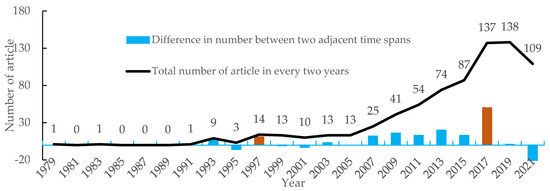 The first study on infrastructure externalities within the dataset turned out to be the study by Poon [32] published in “Land Economics” in 1978. Poon [32] estimated the economic costs of railway pollution by studying its influence on housing prices. The variations in the total number and annual growth number of publications on infrastructure externalities over the period 1978–2021 are shown in Figure 2. Because the publications span over 44 years, this study displayed the distribution of the articles by taking every two years as a unit. Moreover, the data retrieval was performed in September 2021 and the number of documents in 2021 is relatively small.