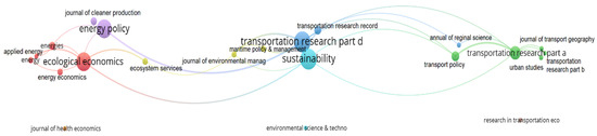 The quality of a journal is often used to estimate the worth of original research articles and reviews [36]. The results of direct citation analysis of journals reflect the relevance of various journals and disciplines. By setting the minimum number of documents of a source and the minimum number of citations of a source at 5 and 0 in VOSviewer, respectively, a network comprised of 22 journals and 29 links was created and visualized by weights of documents, as shown in Figure 3. VOSviewer uses a node and a link to represent an item and a connection between two nodes in a graph, respectively [37].